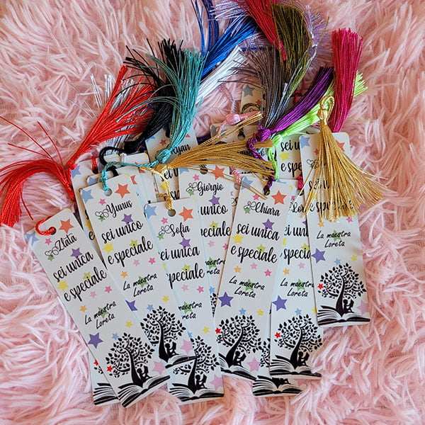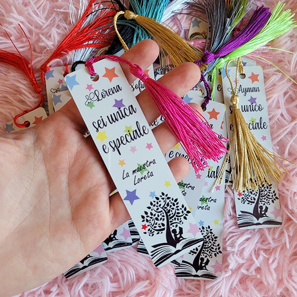 Segnalibro in alluminio con stampa a sublimazione su un lato (retro alluminio/grigio) da 12 x 3 cm circa e meno di un mm di spessore. Personalizzabile per qualsiasi occasione.