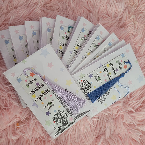 E’ possibile scegliere di aggiungere cartoncino sul fondo (con la stessa grafica del segnalibro) da solo o con la confezione con sacchettino trasparente o la scatolina. La scatolina viene